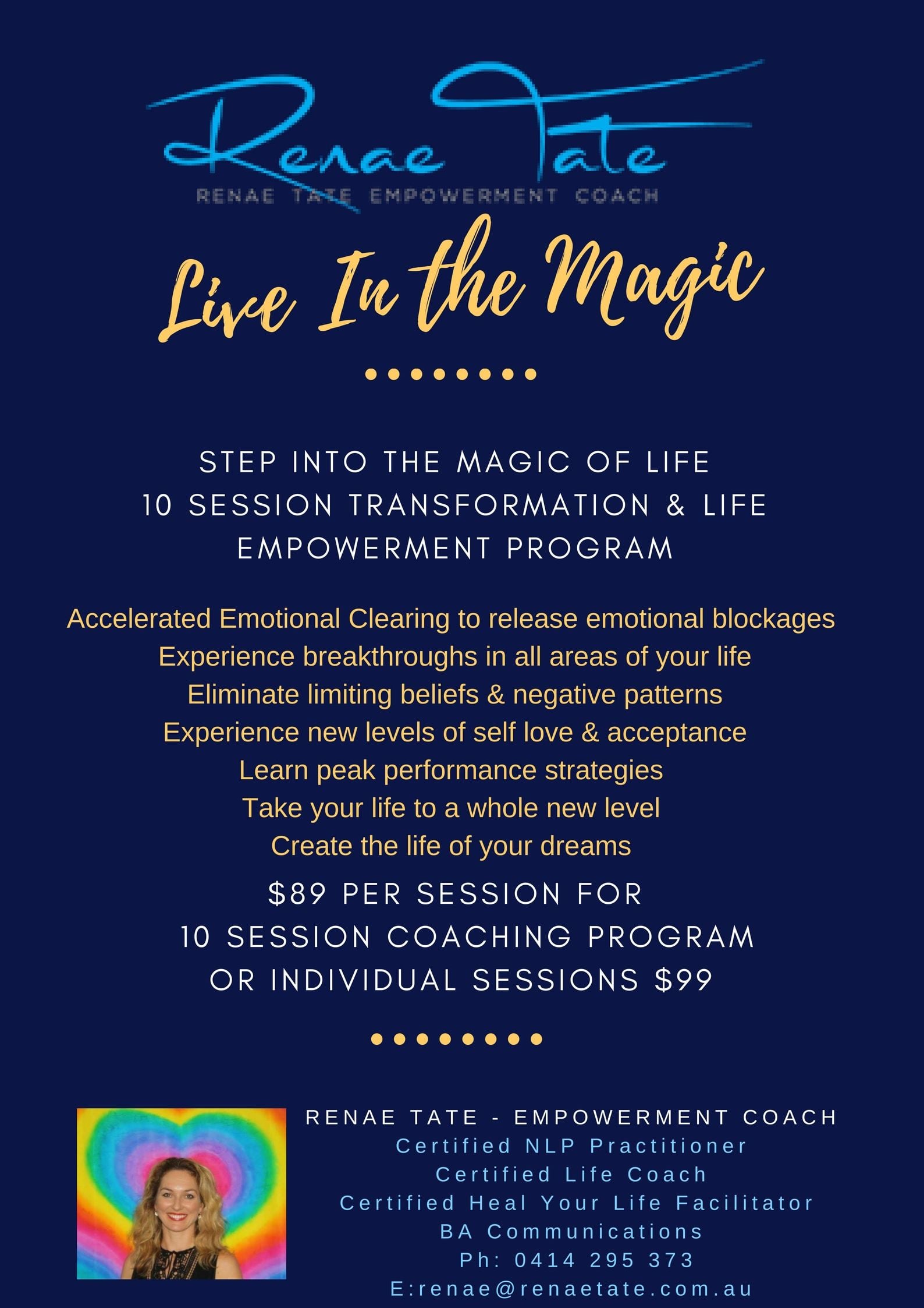 The empowerment coaching sessions and programs will help you transform yourself and all areas your life by working at a conscious and subconscious level – where changes happen fast and really last. Renae is also passionate about giving you the tools to be self empowered in your own life for the future.